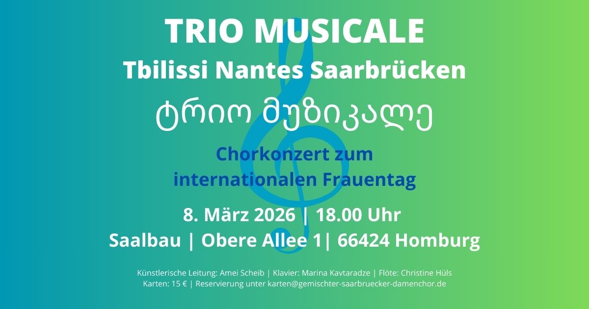 Zum internationalen Frauentag am 8. März führen wir unser Programm Trio Musicale in Homburg auf! Lasst euch von Klängen, Texten und Liedern dreier Nationen überraschen und feiert gemeinsam mit uns die langjährige Brücke zwischen den Partnerstädten Tblissi, Nantes und Saarbrücken.